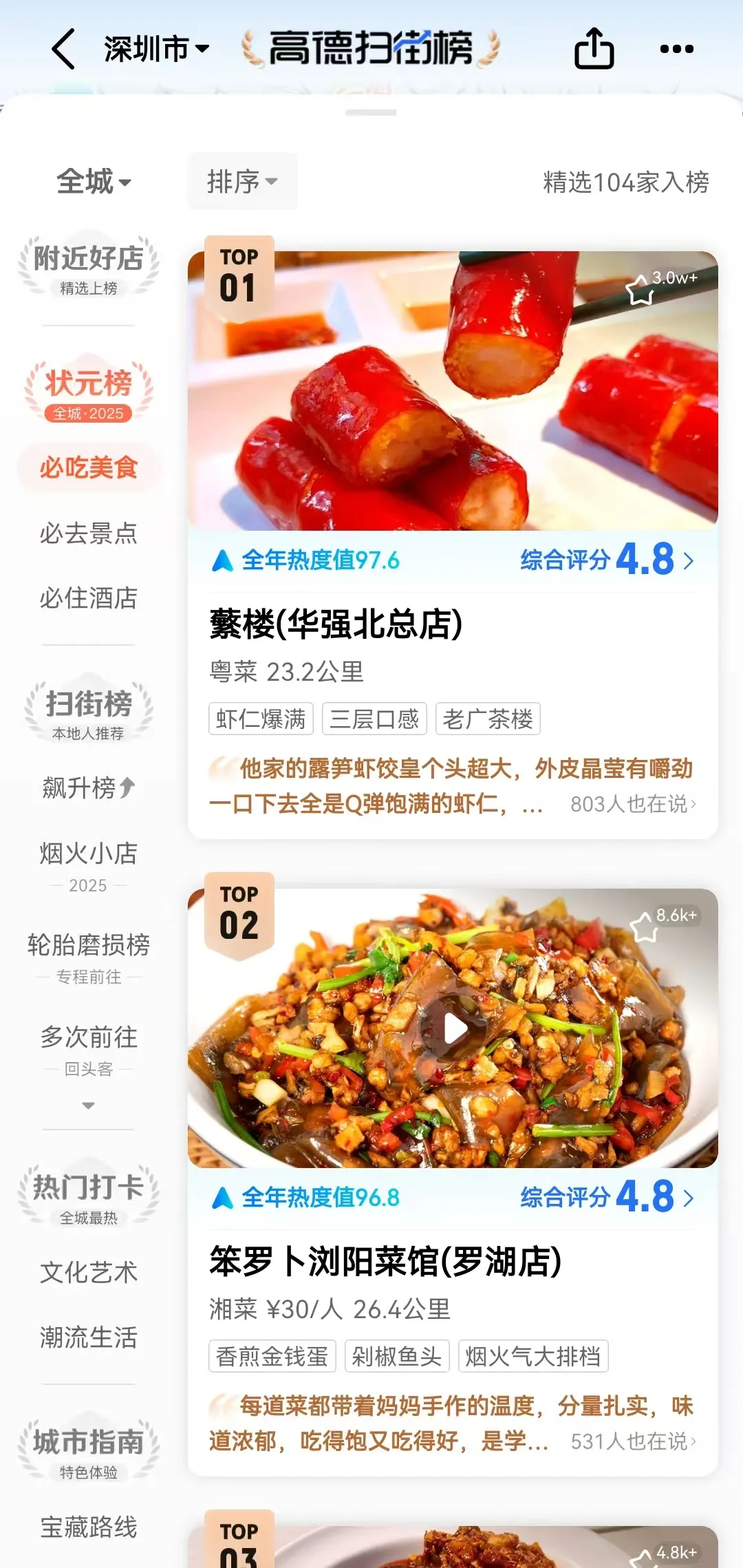 大众点评之外,阿里旗下的高德地图,适时推出了高德扫街榜。高德扫街榜颠覆了传统主观评价模式,是全球首个基于用户导航、到店行为数据生成的线下服务榜单。